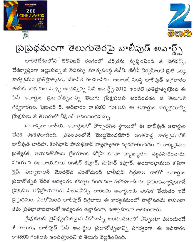Zee Entertainment Enterprises Ltd (ZEE), India's leading television, media and entertainment conglomerate is set to host the World's Biggest Viewers' Choice Awards - Zee Cine Awards 2012 at Asia's leading destination for business, leisure and entertainment, The Venetian® Macao-Resort-Hotel. Since its inception in 1998, Zee Cine Awards has emerged as the biggest tribute paid to the world's largest film industry and has attracted renowned stalwarts of both Indian and international cinema. Besides the local citizens of Macau and several others flying in from overseas to especially attend the glitzy ceremony, the awards will attract over 600 million viewers worldwide. In India, it will be telecast on Sunday, February 5 on Zee TV with a simulcast on Zee Telugu also for the very first time.
