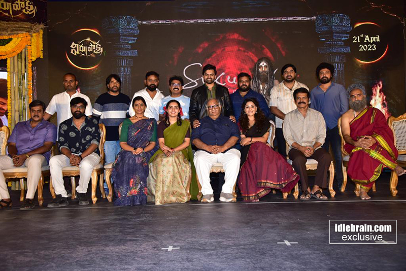 సుప్రీమ్ హీరో సాయిధరమ్ తేజ్ హీరోగా నటిస్తున్న పాన్ ఇండియా మిస్టీక్ థ్రిల్లర్ విరూపాక్ష. సంయుక్తమీనన్ కథానాయిక. కార్తీక్ దండు దర్శకత్వంలో ప్రముఖ నిర్మాణ సంస్థలు శ్రీ వెంకటేశ్వర సినీ చిత్ర ఎల్ఎల్పీ, సుకుమార్ రైటింగ్స్ బ్యానర్స్పై బాపినీడు బి.సమర్పణలో ప్రముఖ నిర్మాత బీవీఎస్ఎన్ ప్రసాద్ ఈ చిత్రాన్ని నిర్మిస్తున్నారు. పాన్ ఇండియా స్థాయిలో తెలుగు, తమిళ, మలయాళ, కన్నడ, హిందీ భాషల్లో ఏప్రిల్ 21న ప్రపంచవ్యాప్తంగా ఈ చిత్రాన్ని విడుదల చేయడానికి ప్లాన్ చేస్తున్నారు నిర్మాతలు. ఈ చిత్రం ప్రమోషన్లో భాగంగా ఇప్పటి వరకు విడుదలైన టీజర్, పాటలకు స్పందన వచ్చిన సంగతి తెలిసిందే. తాజాగా ఈ మూవీ నుంచి పాత్రలను పరిచయం చేస్తూ నిర్వహించిన కార్యక్రమంలో చిత్రయూనిట్ పాల్గొంది.