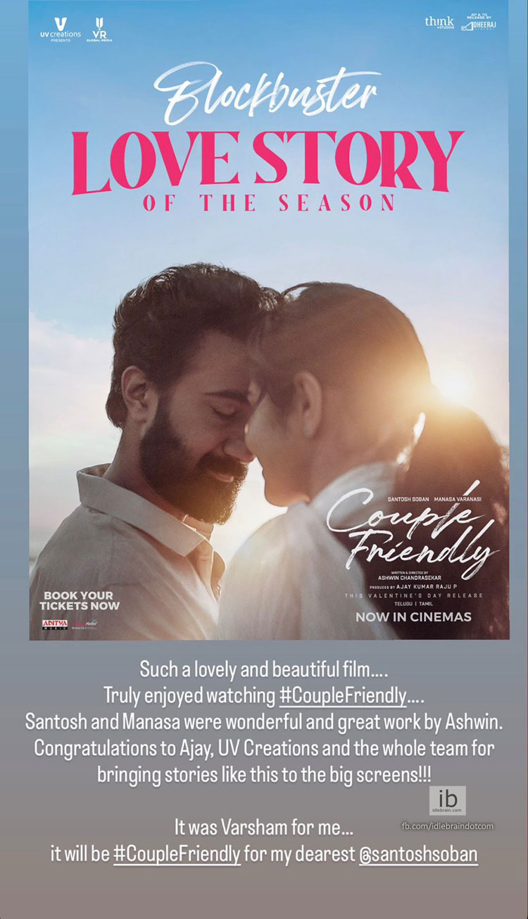 The movie Couple Friendly, starring Santosh Soban and Manasa Varanasi, has hit the screens and achieved a good response from audiences. Praising the film, Rebel Star Prabhas shared an Instagram post expressing his admiration. He mentioned that while he would remember Varsham, Santosh Soban would be remembered for Couple Friendly. He described the film as a lovely, beautiful love story and said he truly enjoyed watching it. Prabhas appreciated the chemistry between Santosh and Manasa and praised director Ashwin for his talented filmmaking. He also congratulated co-producer Ajay and UV Creations for bringing such a good story to the screen.