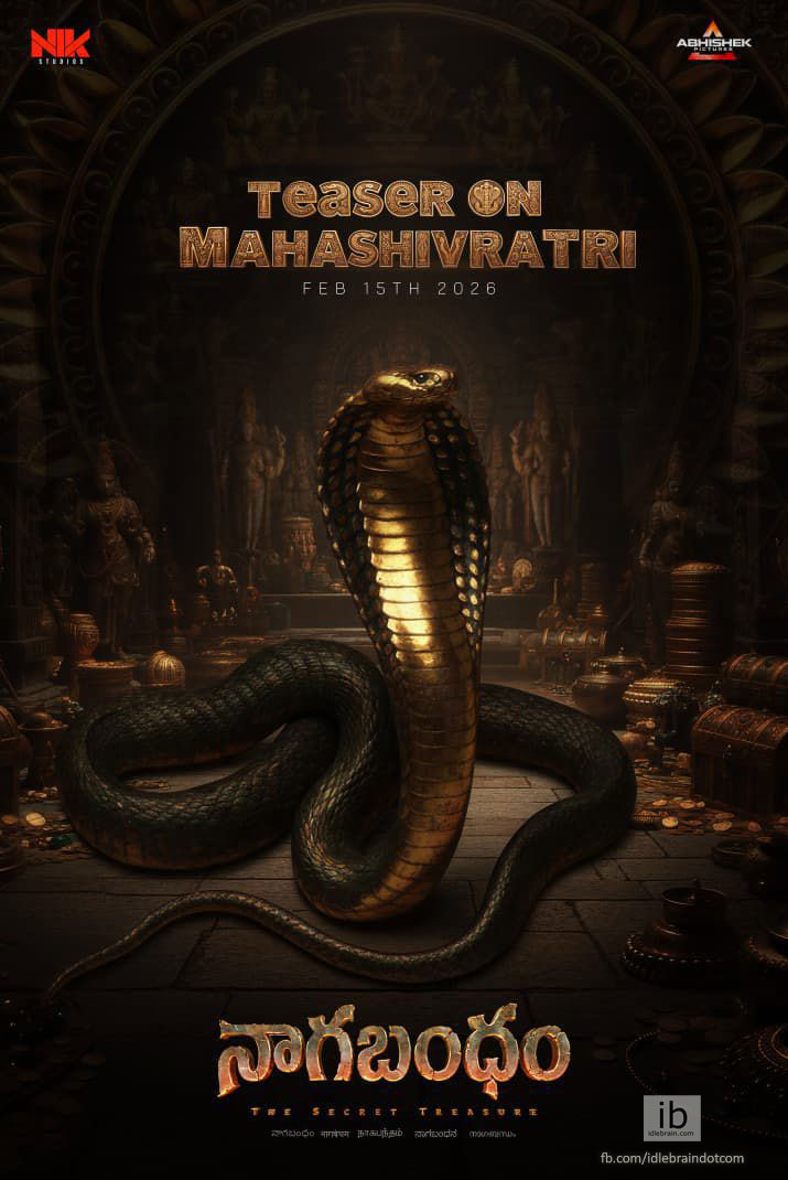 The striking teaser poster features a majestic cobra coiled protectively around a hidden treasure within an ancient temple, perfectly teasing the film's mystical suspense and divine intrigue. This glimpse into the core narrative promises a thrilling dive into the sacred Nagabandham tradition, set against India's historic Vishnu temples.