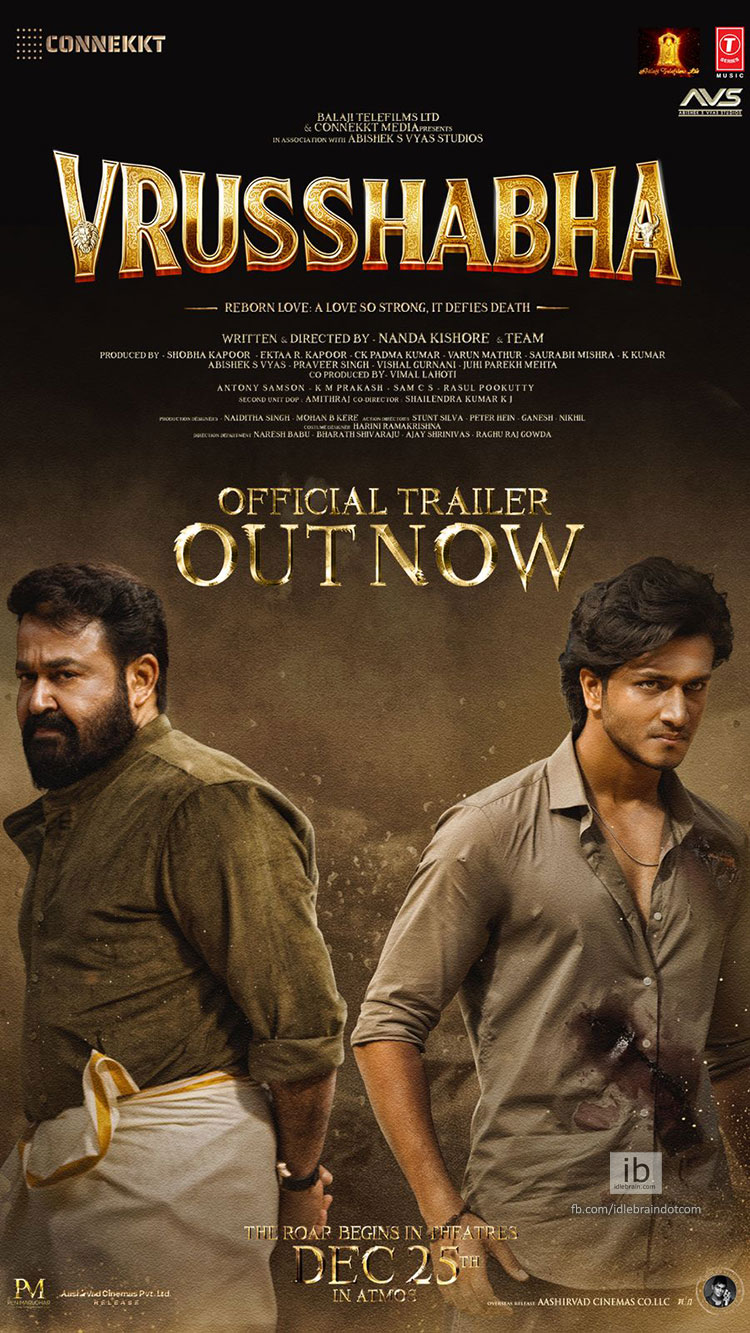 మలయాళ స్టార్ హీరో మోహన్ లాల్ నటిస్తున్న ప్రెస్జీజియస్ మూవీ "వృషభ". ఈ భారీ బడ్జెట్ చిత్రాన్ని గీతా ఫిలిం డిస్ట్రిబ్యూషన్ తెలుగు ఆడియెన్స్ ముందుకు తీసుకొస్తోంది. ఈ నెల 25 "వృషభ" సినిమా గీతా ఫిలిం డిస్ట్రిబ్యూషన్ ద్వారా గ్రాండ్ థియేట్రికల్ రిలీజ్ కు రెడీ అవుతోంది. ఈ చిత్రాన్ని కన్నెక్ట్ మీడియా, బాలాజీ టెలిఫిల్మ్స్, అభిషేక్ ఎస్ వ్యాస్ స్టూడియోస్ బ్యానర్లపై శోభా కపూర్, ఏక్తా ఆర్ కపూర్, సి.కె. పద్మ కుమార్, వరుణ్ మాథుర్, సౌరభ్ మిశ్రా, అభిషేక్ ఎస్ వ్యాస్, ప్రవీర్ సింగ్, విశాల్ గుర్నాని, జూహి పరేఖ్ మెహతా నిర్మిస్తున్నారు. విమల్ లహోటి సహ నిర్మాతగా వ్యవహరిస్తున్న "వృషభ" సినిమాను దర్శకుడు నందకిషోర్ మలయాళం, తెలుగులో రూపొందించారు. తాజాగా "వృషభ" సినిమా ట్రైలర్ ను రిలీజ్ చేశారు. సరికొత్త సినిమాటిక్ ఎక్సిపీరియన్స్ ఇచ్చేలా ఉన్న ఈ ట్రైలర్ ఇన్ స్టంట్ గా మూవీ లవర్స్ ను ఆకట్టుకుంటోంది.