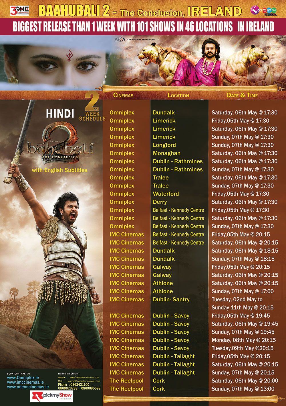 3 ONE ENTERTAINMENTS Proudly Announces that BAHUBALI2-The Conclusion is releasing in 4 Languages (#HINDI ,#TELUGU , #TAMIL & #MALAYALAM ) for Allover Ireland.
