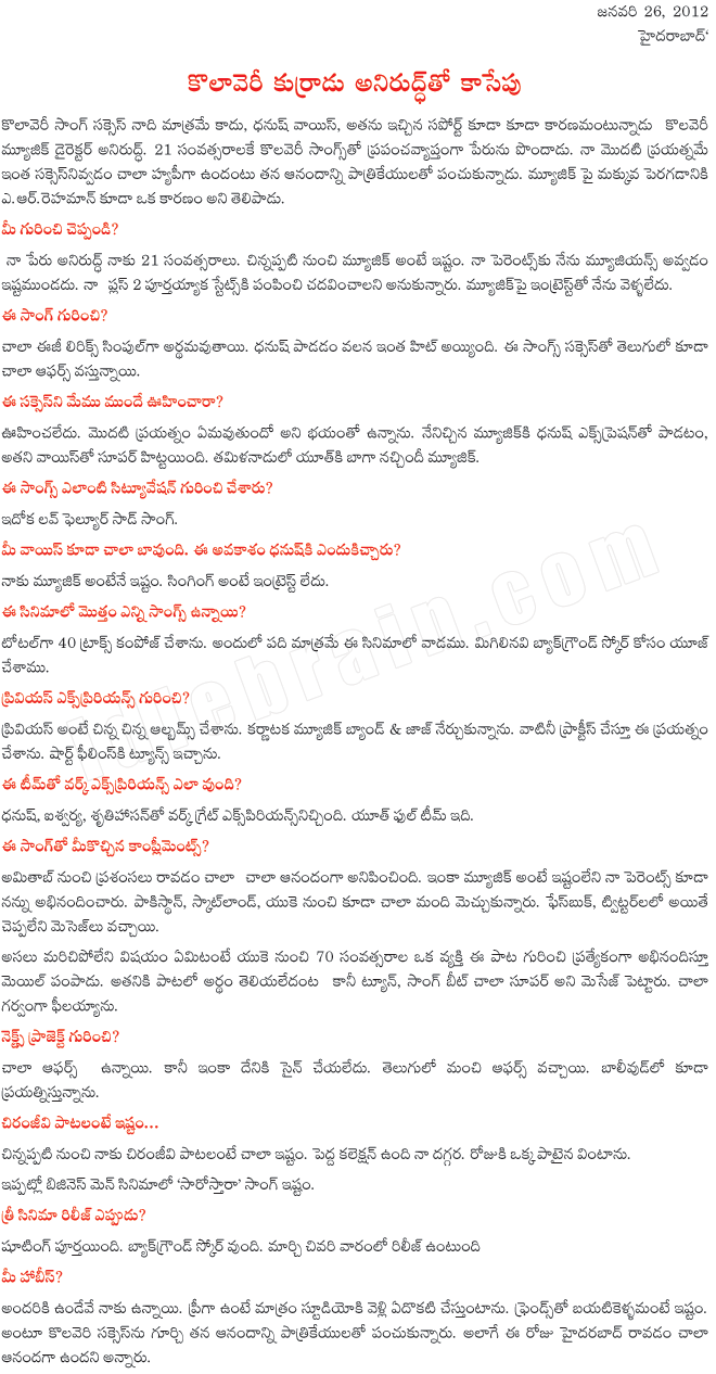 Kolaveri song Music Director - Anirudh Interview part 1 (7:09 minutes)