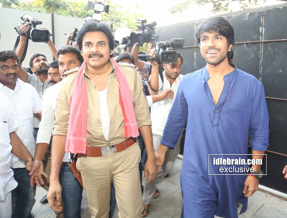 Sardar Gabbar Singh, directed by Bobby and produced by Sharat Marar, is now progressing at rapid pace and PK came to Chiru’s house in the same attire of his role. About the release of the movie he said it is unlikely to be released for Sankranthi.