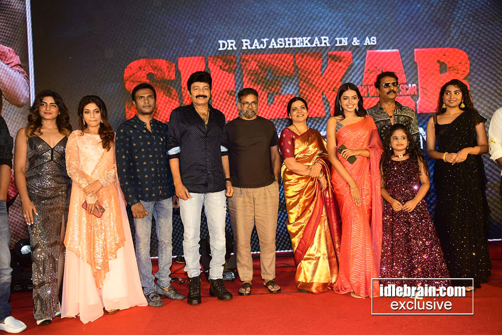 డెత్ బెడ్ నుండి తిరిగొచ్చి సినిమా చేయగలిగాను అంటే దానికి కారణం మీ అందరి ఆశీర్వాదం వలనే..అందరూ కలసి నన్ను బతికించినట్లే నా సినిమాను చూసి మా బతుకు తెరువును మళ్లీ బతికించండి. అన్నారు హీరో రాజశేఖర్.వంకాయలపాటి మురళీక్రిష్ణ సమర్పణలో పెగాసస్ సినీ కార్ప్, టారస్ సినీ కార్ప్, సుధాకర్ ఇంపెక్స్ ఐపీఎల్, త్రిపురా క్రియేషన్స్ పతాకాలపై డా. రాజశేఖర్ హీరోగా ప్రకాష్ రాజ్, ఆత్మీయ రాజన్, జార్జ్ రెడ్డి ఫేమ్ ముస్కాన్, అభినవ్ గోమఠం, కన్నడ కిషోర్, సమీర్, భరణి శంకర్, రవి వర్మ, శ్రవణ్ రాఘవేంద్ర నటీనటులుగా జీవితా రాజశేఖర్ దర్శకత్వంలో బీరం సుధాకర్ రెడ్డి, శివాని రాజశేఖర్, శివాత్మిక రాజశేఖర్, వెంకట శ్రీనివాస్ బొగ్గరం సంయుక్తంగా నిర్మిస్తున్న చిత్రం “శేఖర్”. ఈ చిత్రాన్ని నిర్వాణ సినిమాస్ సృజన ఎరబోలు ఓవర్సీస్ లో విడుదల చేస్తున్నారు. ఆదిత్య మ్యూజిక్ ద్వారా ఈ చిత్రం లోని పాటలను విడుదల చేస్తున్నారు. అన్ని కార్యక్రమాలు పూర్తి చేసుకొని ప్రపంచ వ్యాప్తంగా మే 20న గ్రాండ్ గా విడుదలవుతున్న సందర్భంగా "శేఖర్" ప్రి రిలీజ్ ఈవెంట్ కార్యక్రమం హైదరాబాద్ హోటల్ దస్పల్లా లో చిత్ర యూనిట్ ఘనంగా జరుపుకుంది. ఈ కార్యక్రమానికి ముఖ్య అతిధులుగా వచ్చిన సక్సెస్ ఫుల్ దర్శకుడు సుకుమార్, జాంబి రెడ్డి దర్శకుడు ప్రశాంత్ వర్మ, పాటల రచయిత రామజోగయ్య శాస్ట్రీ, ప్రొడ్యూసర్ కౌన్సిల్ సెక్రటరీ ప్రసన్న కుమార్, నటుడు సముద్ర ఖని, దర్శకుడు విజయ్ భాస్కర్, హీరో రాజ్ తరుణ్, కమెడియన్ శివారెడ్డి, నిర్మాత రాజ్ కందుకూరి, హీరో శివ కందుకూరి, కలర్ ఫోటో దర్శకుడు సందీప్ రాజ్, నిర్మాత రామసత్య నారాయణ , దొరసాని దర్శకుడు మహేంద్ర,, దర్శకుడు జ్ఞాన సాగర్, మరియు చిత్ర యూనిట్ ఈ కార్యక్రమంలో పాల్గొన్నారు.