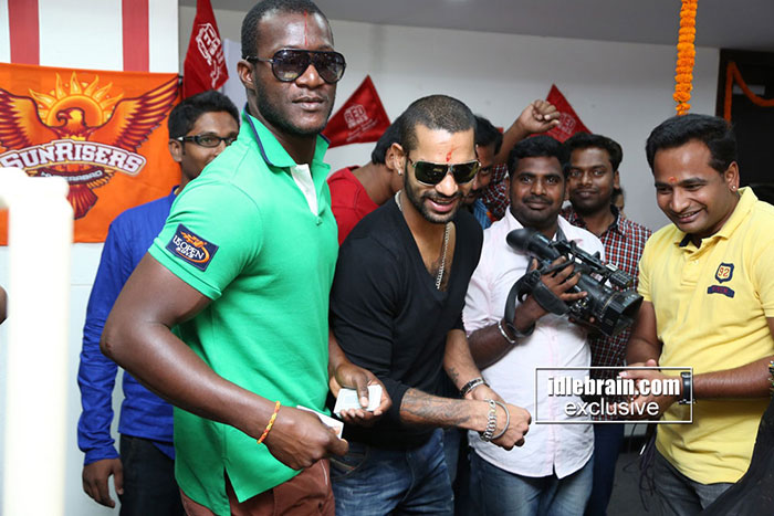 Red FM adorned festive atmosphere today to welcome SunRisers Captain SHikar DHawan and allrounder Darren Sammy to Red FM Office in Banjara Hills Hyderabad . Live dhol players played the traditional teen maar beat to which the players were welcomed by dancing RJs. The Cricketers joined the fun and danced along with the RJs .The entire office was decorated to resemble mini HYderabad and RJs organised stalls which gave them a feel of Hyderabad. Each stall had a special significance while one stall was decked to resemble chudibazaar another stall had all the eateries which are specialites of Hyderabad like Cutting Chai, Osmania Biscuit, Chota samosa , Biryani. They also had fun stalls where the cricketers to play games. The players let their gaurd down after yesterday's gruelling match and had fun mingling with the RJs and other employees.