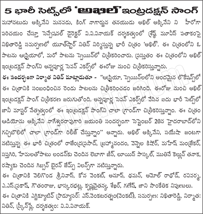 Akhil intro song to be shot in 5 big sets