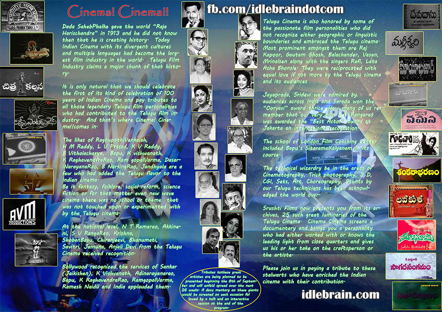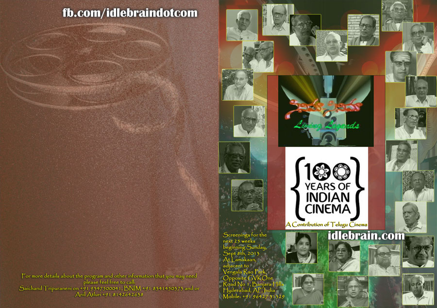 Celebrating Telugu Cinema Contribution to 100years Indian Cinema at "Lamakaan" Banjara Hills, Hyderabad. from 8th September (Evening 6.15). Every Week A documentary, Total 25 Shows on Teugu cinema Legends.