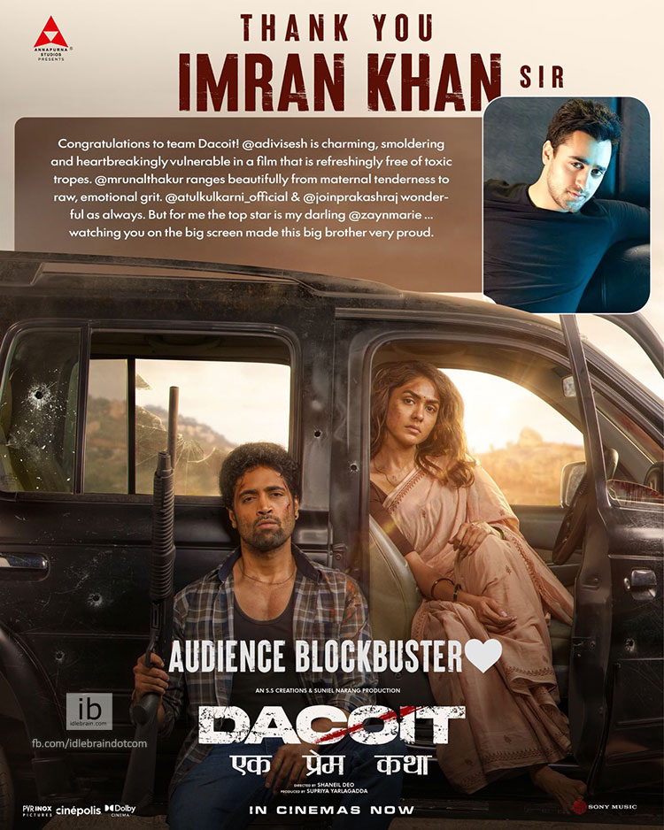 The praise for the film has transcended regional boundaries, with Bollywood star Imran Khan recently sharing his admiration. He took a moment to write a wonderful review for the team, stating, "Congratulations to team Dacoit! @adivisesh is charming, smoldering and heartbreakingly vulnerable in a film that is refreshingly free of toxic tropes."