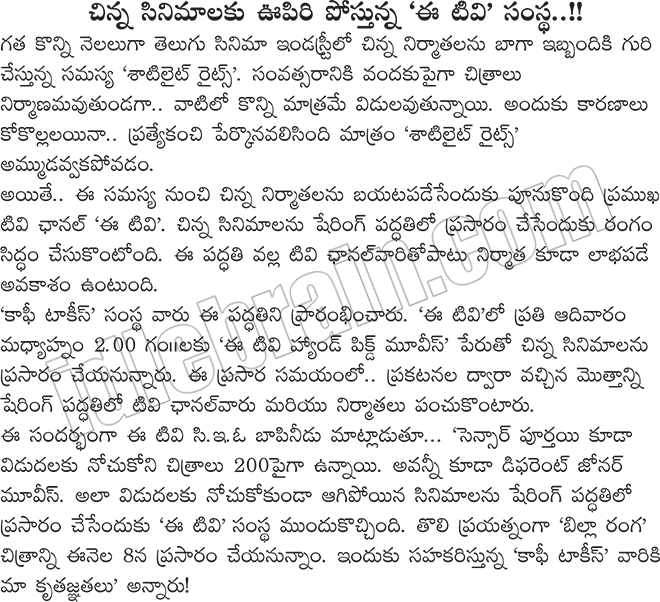 In a landmark decision ETV the leading Telugu channel in AP has announced a special Prime Slot on Sunday’s titled “ETV Hand Picked Movie” slated to start from June 8th. ETV will be airing special Hand Picked Movies at 2 PM. The interesting and special thing about this slot is that ETV would be sharing the revenues earned out of the advertisements from this new slot with the filmmakers. Opening film for this slot is the much talked about & film critically acclaimed film “ Billa Ranga” which is getting shown on June 8th.