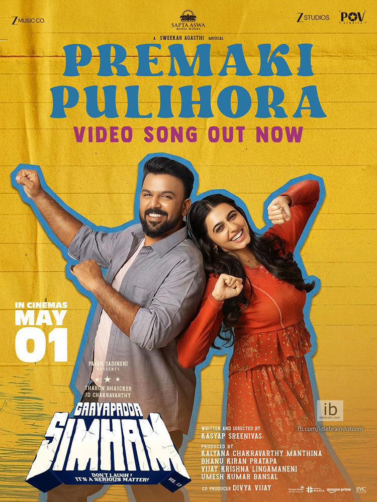 Tharun Bhascker has teamed up with debut director Kasyap Sreenivas for a fresh and modern entertainer Gaayapadda Simham. The film is presented by Pavan Sadineni and produced by Kalyana Chakravarthy Manthina, Bhanu Kiran Pratapa, Vijay Krishna Lingamaneni, and Umesh Bansal under Saptaswa Media Works, POV Stories, and Zee Studios. Faria Abdullah and Maanasa Choudhary are playing the female leads. The movie already created strong buzz with its fun-filled traiser and previously released songs. Now, the makers have released the fourth single, called Premaki Pulihora.