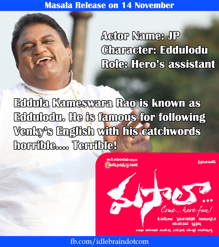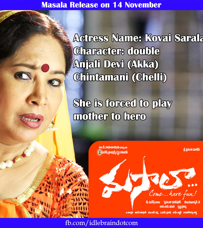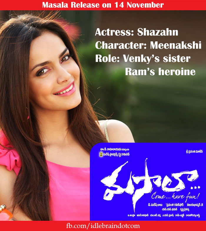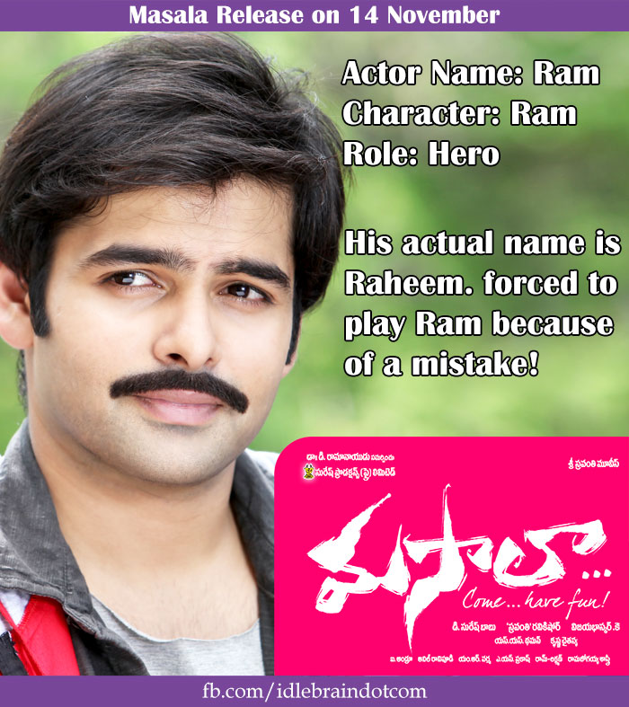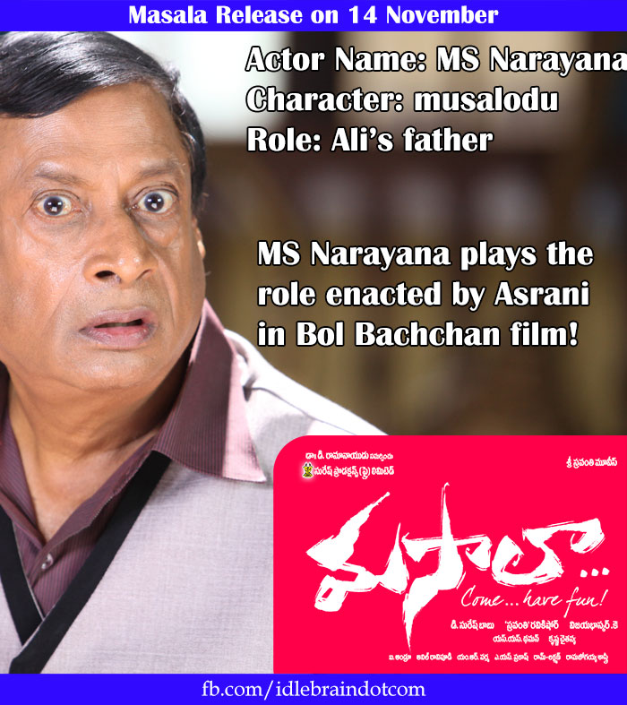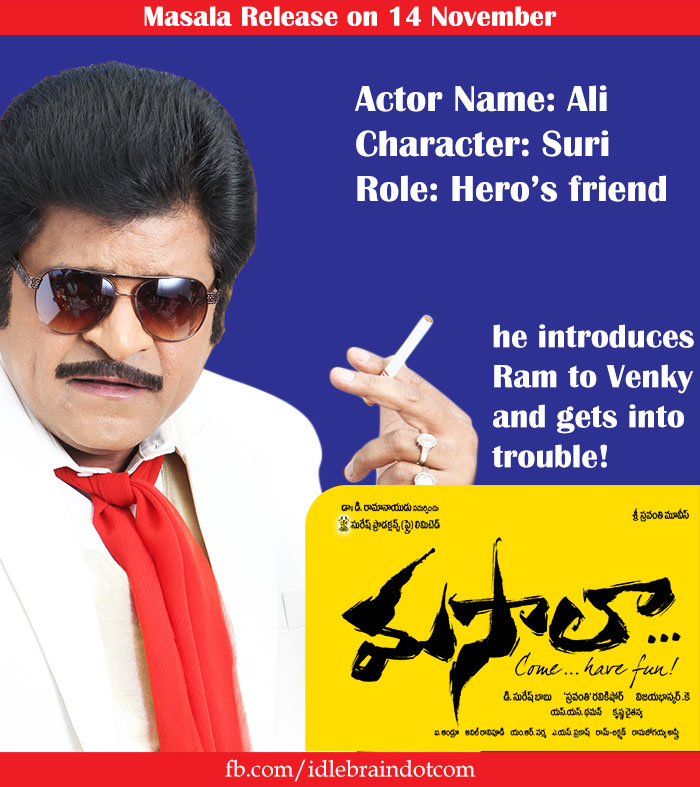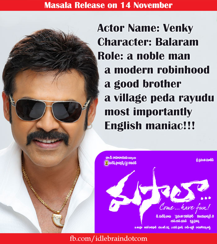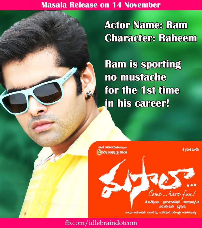 Latest Telugu multistatter Masala featuring Venkatesh and Ram is all set to release on 14 November. This family entertainer has obtained a clean U certificate from the censor board. This film is an official remake of Rohit Shetty's 100 crore Hindi film Bol Bachchan which was loosely based on Hrishikesh Mukherjee's classic Golmaal. Venkatesh's funny english/characterization, Ram's role with two variations, witty dialogues and nice music are going to be assets for this film. This film is coming from the producer-director duo who has given memorable films like Nuvve Kavali and Nuvvu Naaku Nachav. Vijay Bhaskar is the director. D Suresh Babu and Sravanthi Ravi Kishore are the producers. SS Thaman composed music. Anil Ravipudi penned dialogues.