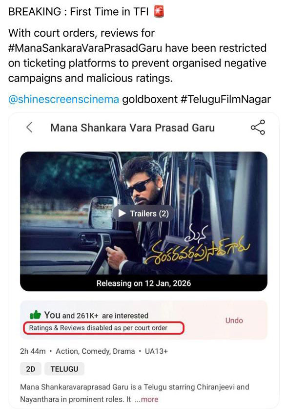 The actor's post was a direct reaction to the news that a ticketing platform had suspended its review and rating features for Anil Ravipudi’s directorial MSVPG ahead of its January 12 Sankranti release. The move follows a court intervention aimed at preventing malicious "organized attacks" that often tank a film's reputation before it even has a chance to reach its audience.