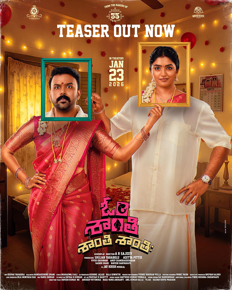 Talented filmmaker-turned-actor Tharun Bhascker, known for his impressive performances on screen, is stepping into the lead once again in a quirky new project- Om Shanti Shanti Shantihi featuring Eesha Rebba as the female lead. The film, marking the directorial debut of A R Sajeev, promises to be a fun-filled rural comedy laced with authentic humor and relatable drama. It’s being jointly backed by S Originals and Movie Verse Studios, with Srujan Yarabolu, Aditya Pittie, Vivek Krishnani, Anup Chandrasekaran, Sadhik Shaik, and Naveen Sanivarapu producing the venture, while Kishore Jaladi and Bala Sowmitri serve as co-producers. With the entire shoot wrapped up, and the post-production works nearing completion, the team has shifted focus to promotions by unveiling the film’s teaser.