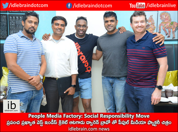 ప్రేక్షకుల అభిరుచులకు తగ్గట్టుగా వైవిధ్యమైన కథా చిత్రాను నిర్మిస్తూ...విజయాలు సాధిస్తూ..అటు ఆడియన్స్ లోను, ఇటు ఇండస్ట్రీలోను అనతి కాలంలోనే ప్రత్యేక గుర్తింపు ఏర్పరుచుకున్న ప్రముఖ నిర్మాణ సంస్థ పీపుల్ మీడియా ఫ్యాక్టరీ. ఎం.ఎల్.ఎ, వైఫ్ ఆఫ్ రామ్, సిల్లీఫెలో, గూఢచారి చిత్రాలను నిర్మించిన ఈ సంస్థ ప్రస్తుతం సమంత అక్కినేని ప్రధాన పాత్రలో ఓ బేబి, విక్టరీ వెంకటేష్ - యువ సమ్రాట్ నాగ చైతన్య కాంబినేషన్ లో భారీ మల్టీస్టారర్ వెంకీ మామ, అనుష్క, మాధవన్, కిల్ బిల్ ఫేమ్ మైఖేల్ మ్యాడసన్ కాంబినేషన్లో ఇంటర్నేషనల్ ఫిల్మ్ సైలెన్స్, నాగ శౌర్యతో చిత్రాలను నిర్మిస్తోంది. ఇలా విజయవంతమైన చిత్రాలను నిర్మిస్తున్న ప్రసిద్ధ చిత్ర నిర్మాణ సంస్థ పీపుల్ మీడియా ఫ్యాక్టరీ, విదేశాలలో షూటింగ్ జరుపుకోవటానికి కావలసిన ఇన్ఫ్రాస్ట్రక్చర్ ను కూడా సమకూరుస్తున్న విషయం విదితమే. కేవలం వ్యాపార దృక్పథమే కాకుండా, వీటితోపాటు సామాజిక స్పృహ కు సంబంధించిన విషయాలలో కూడా ప్రజలలో అవగాహన కల్పించటానికి ప్రణాళికలు సిద్ధం చేస్తున్నారు సంస్థ నిర్మాతలు టి.జి.విశ్వప్రసాద్, వివేక్ కూచిభొట్ల. విషయానికి వస్తే ఈ సంస్థ మరో ముందడుగు వేసి ప్రపంచ ప్రఖ్యాత వెస్ట్ ఇండీస్ క్రికెట్ ఆటగాడు ద్వారెన్ బ్రావో తో , తమ సంస్థ ‘కార్పొరేట్ సోషల్ రెస్పాన్సిబిలిటీ (CRS )’ లో భాగంగా ఓ షార్ట్ ఫిలింను నిర్మించ బోతోంది. దీనికి సంబంధించి నేటి ఉదయం వీరిరువురి మధ్య ఒప్పందాలు జరిగాయి. ఈ కార్యక్రమంలో ద్వారెన్ బ్రావో తో పాటు చిత్ర నిర్మాత టి.జి.విశ్వప్రసాద్,సహ నిర్మాత వివేక్ కూచిభొట్ల, ఎగ్జిక్యూటివ్ ప్రొడ్యూసర్ నటరాజ్ పిళ్ళై లు పాల్గొన్నారు.