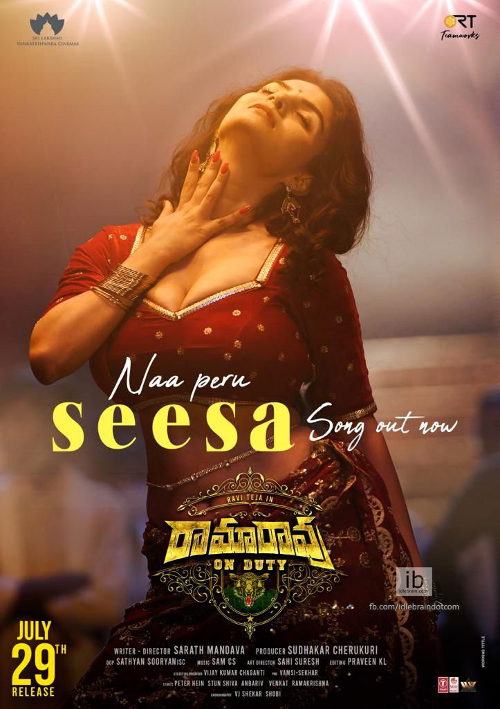 After teasing with the promo, the makers of Mass Maharaja Ravi Teja starrer unique action thriller Ramarao On Duty have unveiled the lyrical video of third single Naa Peru Seesa. Anveshi Jain is introduced as Seesa (Srikakulam Saarangi).