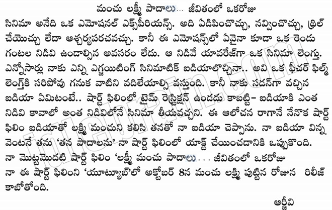 This short film of mine is releasing on Lakshmi Manchu's birthday on October 8th at 11AM