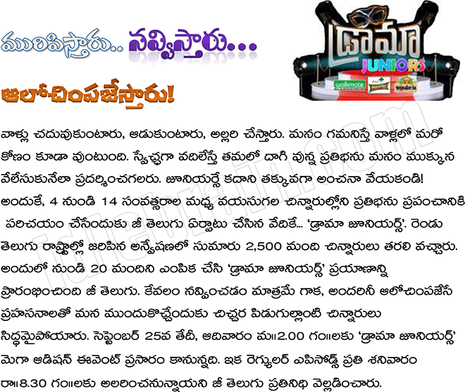For the same reason, Zee Telugu has framed a perfect platform – ‘Drama Juniors’ to expose the hidden skills of the kids aging from 4 to 14 to the entire world. The surfing conducted in both the Telugu States have made almost 2,500 kids approach us. Zee Telugu has started it journey by picking up 20 kids out of the approached. Apart from showering laughters and spreading smiles all around, the naughty tots got ready for this wonderful entertaining show which is about to come up with proper topics which would initiate the viewers to rethink! The Mega Audition for the upcoming ‘Drama Juniors’ is starting on 25th September’16 from 2:00PM onwards. The Zee Telugu Representative has announced that the regular episodes of the show would start enthralling the audiences every Saturday from 8:30 PM onwards.